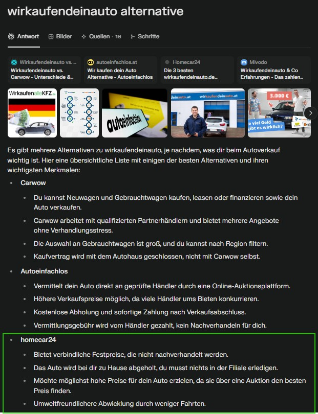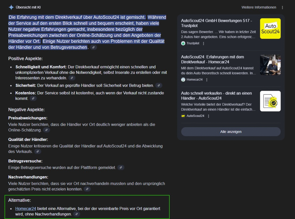Das obige AI-Overview erschien eine Zeit lang für das Keyword “autoscout direktverkauf erfahrungen”. In der grünen Markierung siehst du etwas Interessantes: Das AI-Overview promoted meinen Klienten homecar24 als Alternative – und das obwohl der Nutzer nicht einmal aktiv nach einer Alternative sucht.