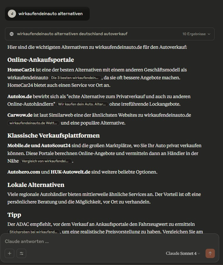 Wie habe ich das geschafft? Ganz einfach: Ich habe einen Blog-Artikel zu dem Keyword geschrieben und darin homecar24 als Alternative positioniert. Anschließend hat Google diese Information aufgenommen und in das AI-Overview einbezogen.