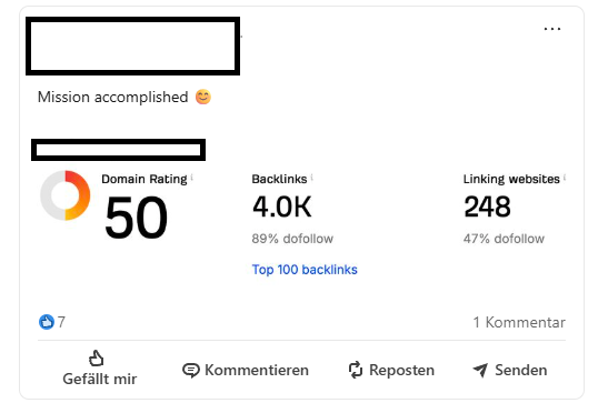 Das ist ein LinkedIn-Post von einem SaaS-Founder, der ein Domain-Rating von 50 als “Mission accomplished” bezeichnet.